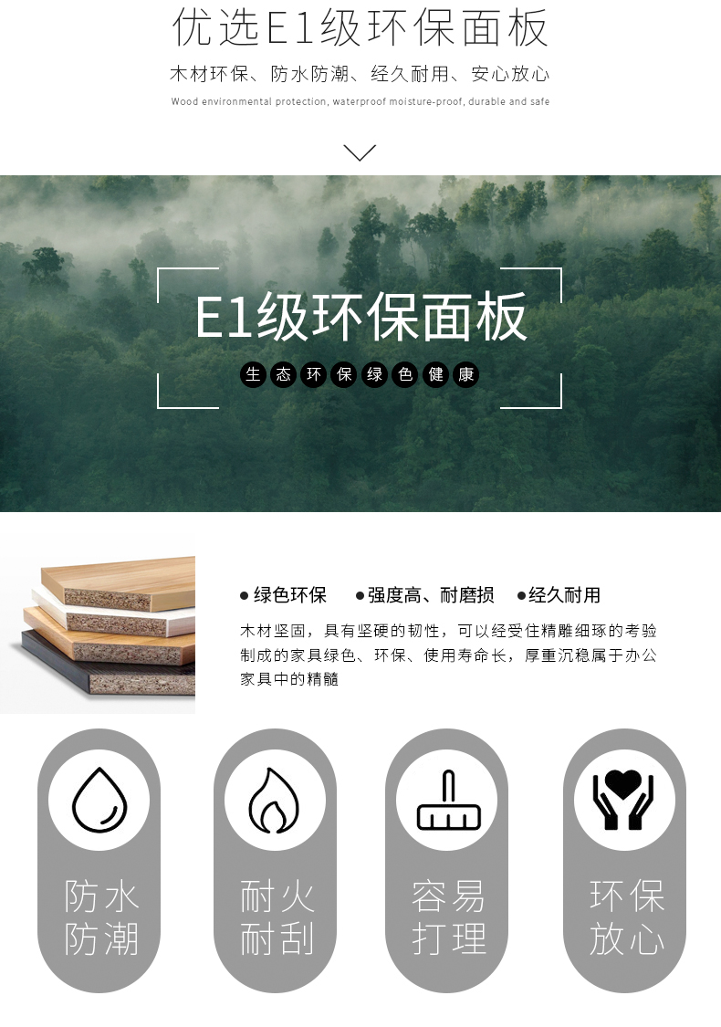 基 材:E1級(jí)達(dá)歐洲環(huán)保標(biāo)準(zhǔn)基材(目前國(guó)內(nèi)辦公家具行業(yè)板式基材標(biāo)準(zhǔn)較高的),此基材用原木壓縮顆粒成型,甲醛含量小于1.2MG/L,具耐磨、抗刻劃、耐高溫、易清潔、耐酸堿等優(yōu)點(diǎn),經(jīng)防蟲、防腐處理,表面握釘力及靜曲強(qiáng)度均達(dá)到國(guó)家標(biāo)準(zhǔn);抗彎性能強(qiáng),不易變形。